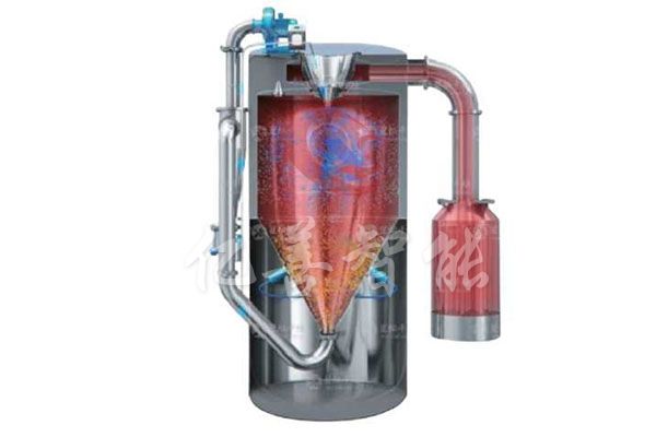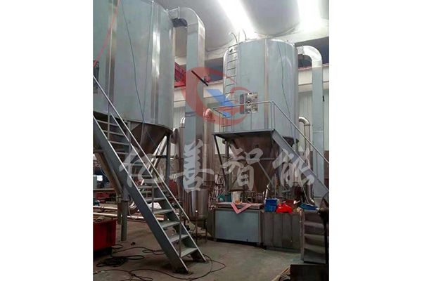 空气经过过滤和加热,进入干燥器顶部空气分配器,热空气呈螺旋状均匀地进入干燥室。料液经塔体顶部的高速离心雾化器,(旋转)喷雾成极细微的雾状液珠,与热空气并流接触,在极短的时间内可干燥为成品。成品连续地由干燥塔底部和旋风分离器中输出,废气由风机排空。