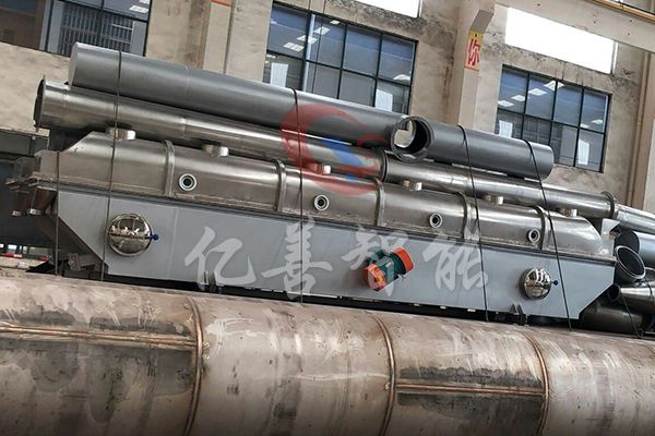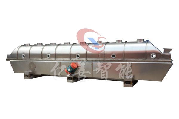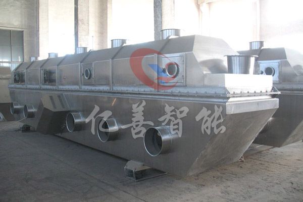 物料自进料口进入机内,在振动力作用下,物料沿水平流化床抛掷,向前连续运动,热风向上穿过流化床同湿物料换热后,湿空气经旋风分离器除尘后由排风口排出,干燥物料由排料口排出。