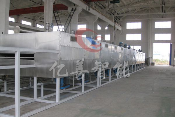 物料由加料器均匀地铺在网带上,网带一般采用12-60目不锈钢丝网,由传动装置拖动在干燥机内移动。干燥机由若干单元组成,每一单元热风独立循环,部分尾气由专门排湿风机排出,废气由调节阀控制,热气由下往上或由上往下穿过铺满物料的网带完成热量与质量传递的进程,带走物料水份。网带缓慢移动,运行速度可根据物料温度自由调节,干燥后的成品连续落入收料器中。上下循环单元根据用户需要可灵活配备,单元数量亦可根据需要选取。