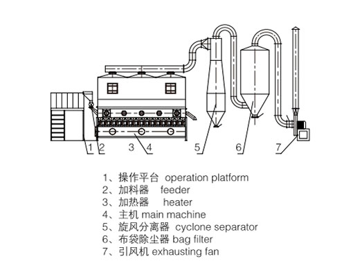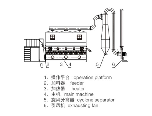 散粒状固体物料由加料器加入流化床干燥器中,过滤后的洁净空气加热后由鼓风机送入流化床底部经分布板与固体物料接触,形成流态化达到气固的热质交换。物料干燥后由排料口排出,废气由沸腾床顶部排出经旋风除尘器组和布袋除尘器回收固体粉料后排空。