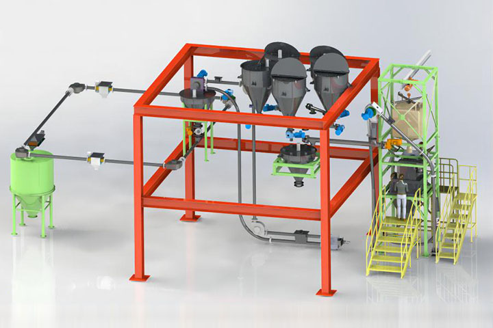称重配料系统可根据生产工艺要求,具体物料特性,合理的选择增量法、减量法、失重式等称重方式,完成批次配料或者连续不间断供料,备有单斗单料、单斗多料、多斗多料和它们的组合等多种工作模式。