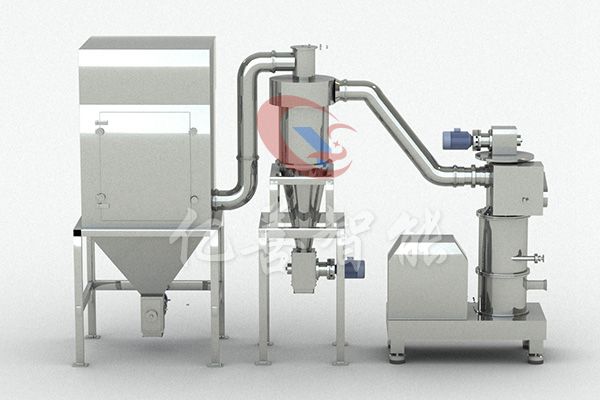 JCFJ系列内分级机械粉碎机主要机构由固定在粉碎转盘外周上的冲击锤块与衬板组成的粉碎室部件,通过传动带与驱动电机相连,水平地安装在机架上;粉碎室中部装有进气管;蜗轮分级机与排气管构成的分级室部件置于粉碎室筒体的上方;分级室与排气管端面设有气封隔离,以阻止粗粉进入成品,在转子滚动轴承前置有气封保护,以防止微粉进入滚动轴承。整个装置简洁、紧凑。粉碎时,待粉碎物料由送料装置均匀送到分级室,在这里进行预先分级,原料中的合格颗粒经分级后从排气管排出,粗颗粒进入粉碎室,在冲击锤块的高速冲击和研磨作用下被粉碎,粉碎后的物料经进气管进入的上升气流作用下输送到蜗轮分级机进行先分级,合格颗粒经分级后从排气管随尾气一起排出后收集为产品,粗颗粒再次返回粉碎室继续粉碎。产品收集部分由旋风分离器和脉冲除尘器及离心风机组成,将粉碎合格的产品收集。