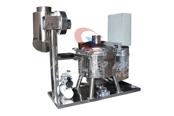 本机工作原理和传统中医研船,脚踏碾轮粉碎原理相同。碾轮在轨道上圆周滚动,加上适当压力,在反复碾轧的过程中使物料粉碎并达到需要的细度。由于碾轮双边刃口有剪切作用,也协同粉碎,特别是纤维性物料。粉碎过程中细的物料飘浮起来被风机吸入,排到旋风集料罐,布袋排出气体,成品料粉留在袋内。