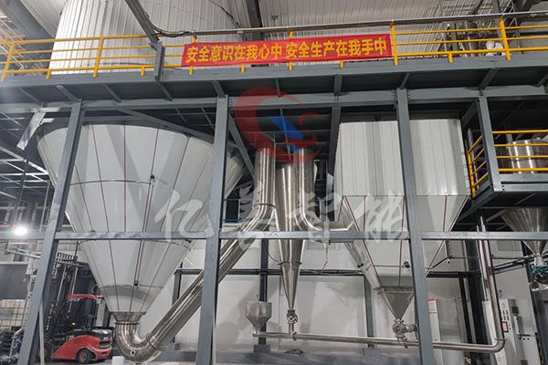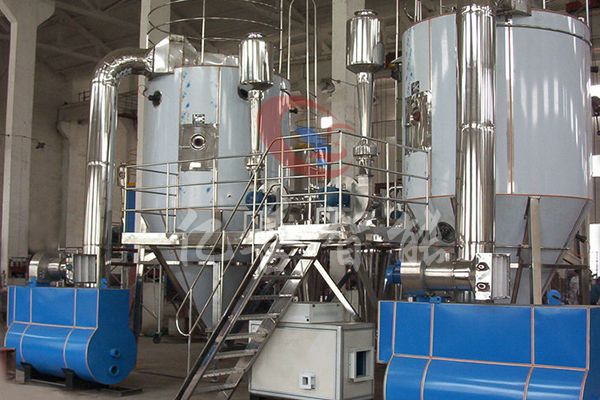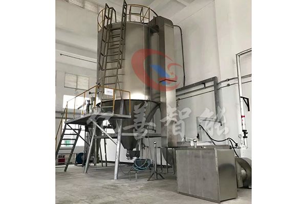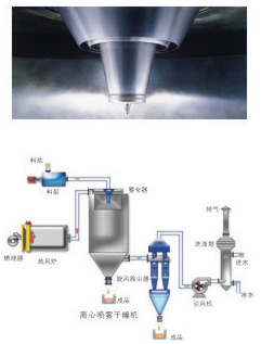 空气经过过滤和加热,进入干燥器顶部空气分配器,热空气呈螺旋状均匀地进入干燥室。料液经塔体顶部的高速离心雾化器,(旋转)喷雾成极细微的雾状液珠,与热空气并流接触,在极短的时间内可干燥为成品。成品连续地由干燥塔底部和旋风分离器中输出,废气由风机排空。