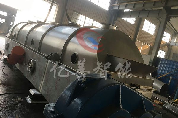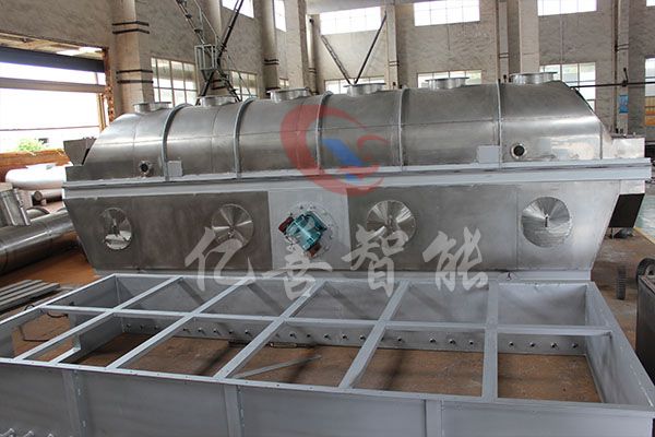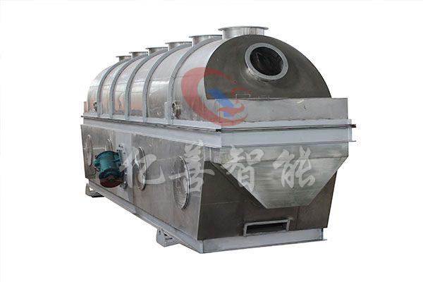 物料自进料口进入机内,在振动力作用下,物料沿水平流化床抛掷,向前连续运动,热风向上穿过流化床同湿物料换热后,湿空气经旋风分离器除尘后由排风口排出,干燥物料由排料口排出。